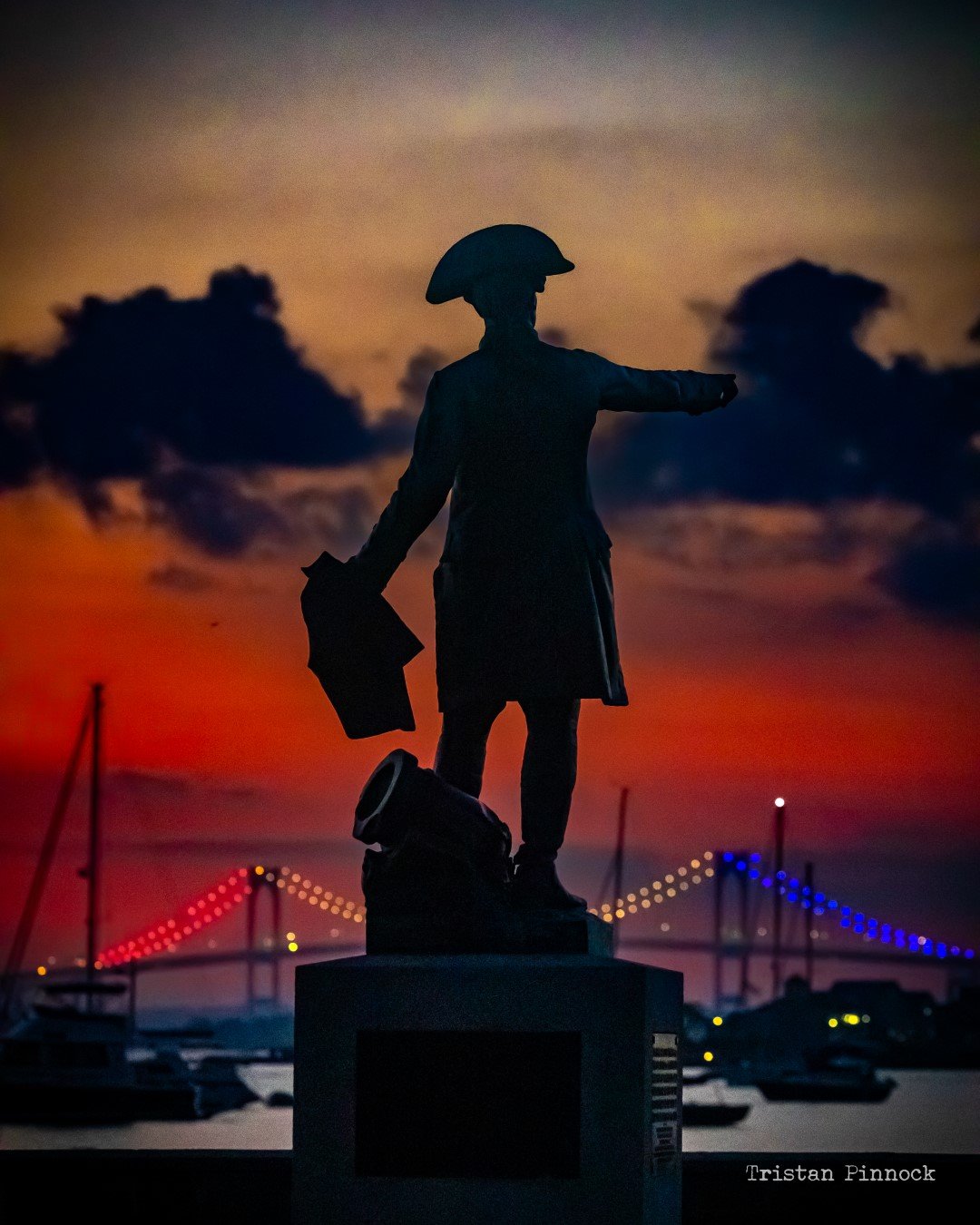 The General Rochambeau Statue in King Park in Newport, RI with the Newport Bridge lit in red, white and blue.